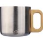 Duplafalú bögre fa fogantyúval. Mosogatógépben nem mosható. Gravírozott újrahasznosított rozsdamentes acél logóval. Egyenként barna kartondobozba csomagolva. Anyaga: újrahasznosított rozsdamentes acél. Űrtartalom: 400 ml.