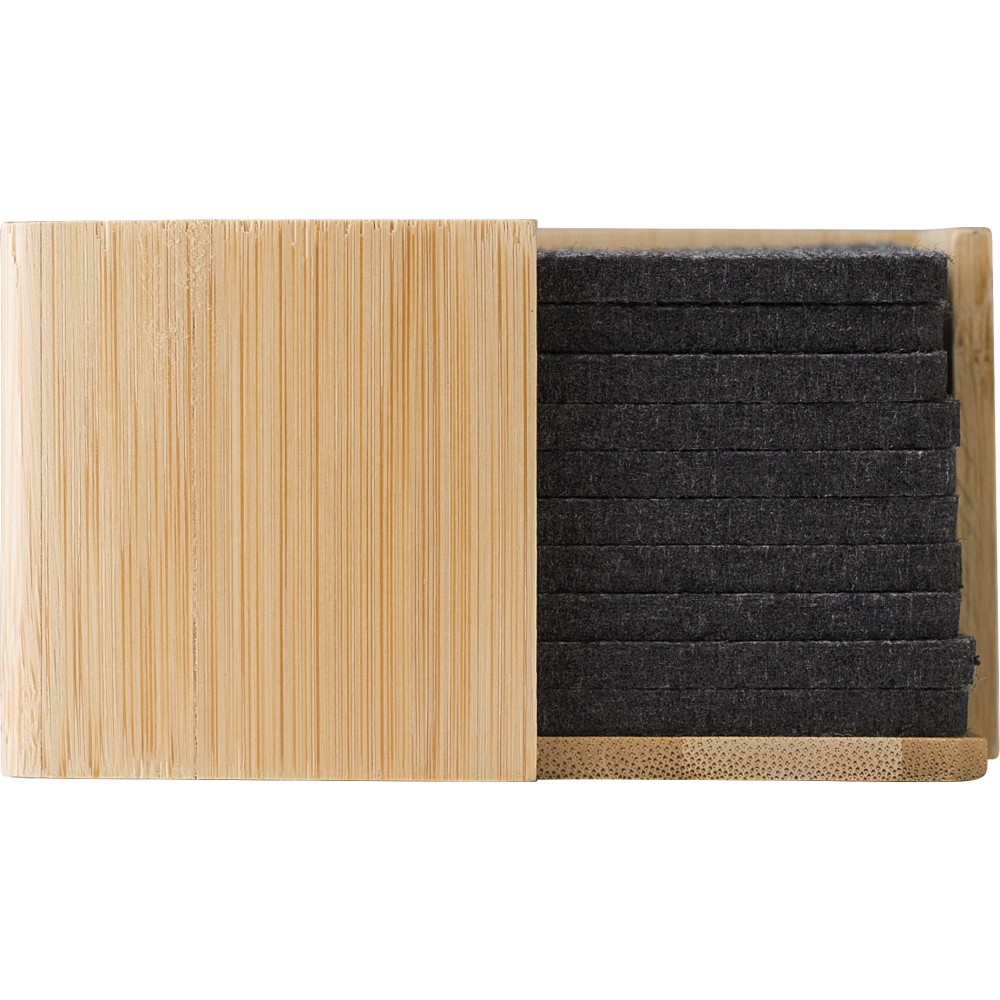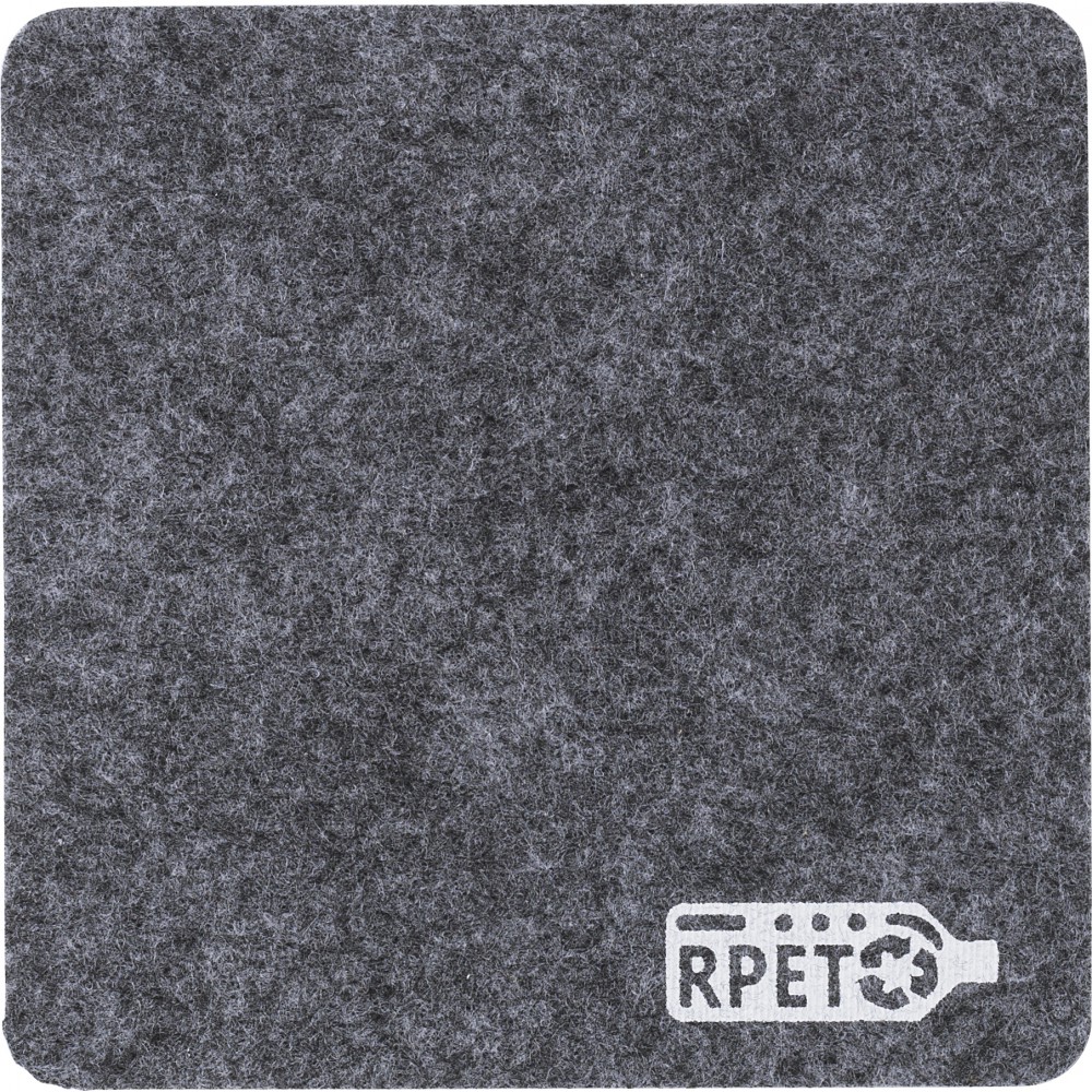 RPET filc poháralátét szett bambusz tokban. 10 darab alátétet tartalmaz. Barna kartondobozba csomagolva. Minden alátéten szerepel az újrahasznosított jel nyomata.