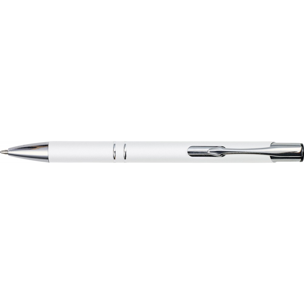 Golyóstoll gumis felülettel, krómozott kiegészítőkkel, kék tollbetéttel. Fém.