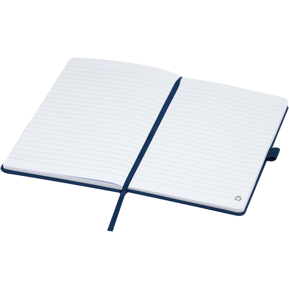A5 jegyzetfüzet újrahasznosított PET műanyagból készült szövet borítóval. 80 lap 70 g/m2 újrahasznosított, vonalas papír, tolltartó hurok és szalag könyvjelző. Kombinálható a 107757 Honua RPET golyóstollal.