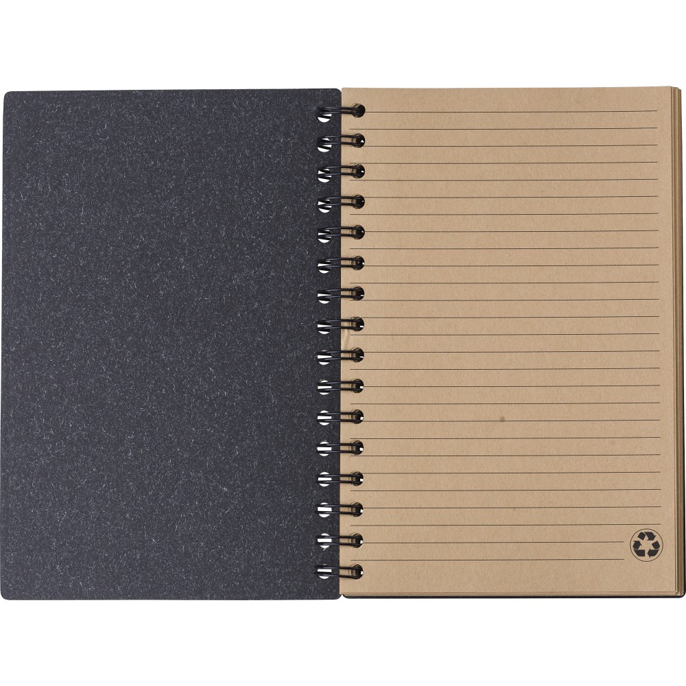 Újrahasznosított kartonból készült, keményfedeles spirálfüzet 80 vonalas, újrahasznosított barna papírlappal. Lapok minősége: 65 g/m2. Az újrahasznosított alapanyagra utaló logó minden lapon látható.