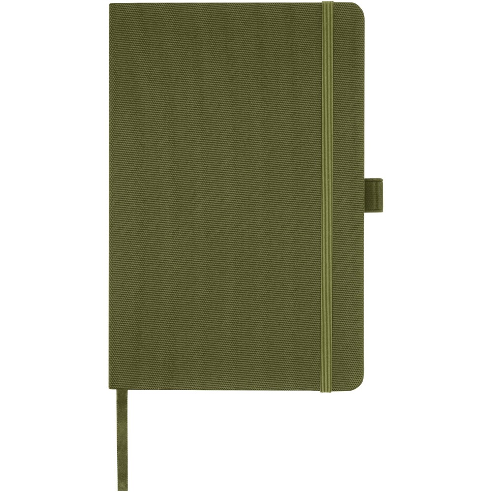 A5 jegyzetfüzet újrahasznosított PET műanyagból készült szövet borítóval. 80 lap 70 g/m2 újrahasznosított, vonalas papír, tolltartó hurok és szalag könyvjelző. Kombinálható a 107757 Honua RPET golyóstollal.
