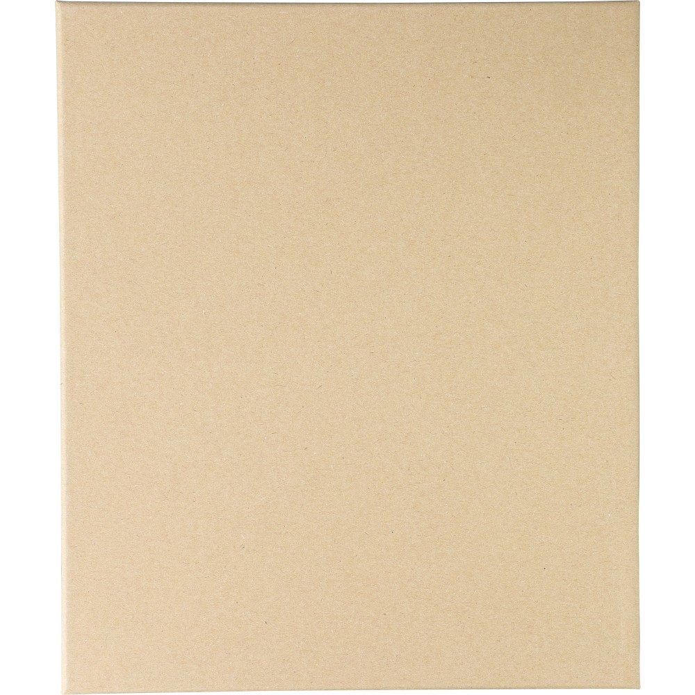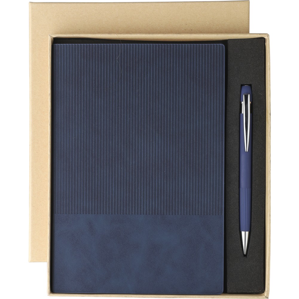 Újrahasznosított PU jegyzetfüzet és golyóstoll szett. A jegyzetfüzet kb. A5-ös méretű, 100 lapos, 80 g/m2-es vonalas lapokkal és szalagos könyvjelzővel, kordbársony hatású borítóval és dombornyomott újrahasznosított logóval rendelkezik. A golyóstoll gumírozott felülettel, csíkos markolattal, krómozott heggyel és lézergravírozott újrahasznosított logóval rendelkezik. Erős barna kartondobozban, EVA betéttel. Kék tollbetéttel szállítjuk.