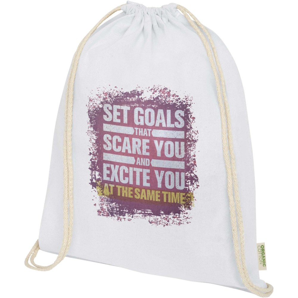OCS tanúsítvánnyal rendelkező, 100% organikus pamutból készült húzózsinóros hátizsák környezetbarát és praktikus választás. A termék egy tágas főrekesszel és pamut zsinóros záródással rendelkezik, amely biztonságos tárolást garantál értéktárgyak számára. A táska teherbírása legfeljebb 5 kg. Űrtartalma: 5 liter. 140 g/m2 anyag.
