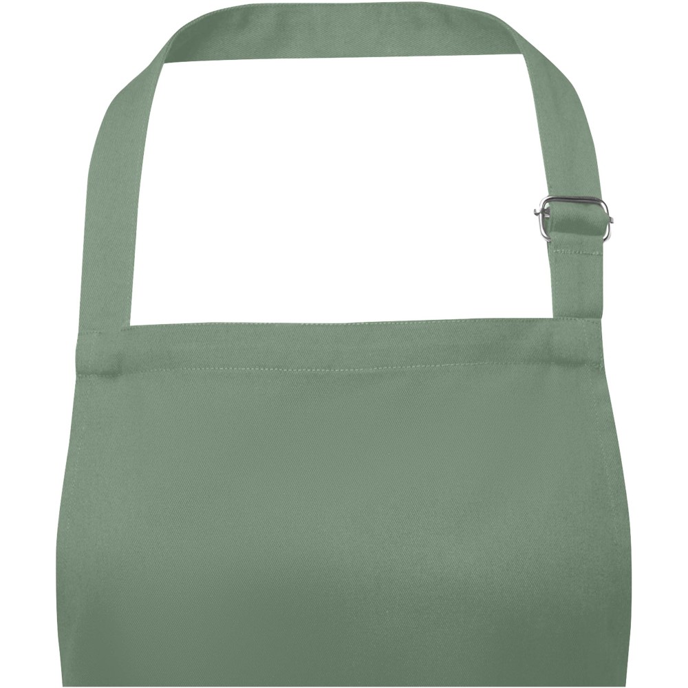 Vastag és masszív anyag, ugyanakkor puha és kényelmes viselet. A két elülső zseb gyors és egyszerű módot kínál a konyhai eszközök tárolására. A kötény nyakában csattal állítható, hátul megköthető. Nagyméretű nyomtatási lehetőség a logók megjelenítéséhez. Pamut twill 65% poliészterből és 35% pamutból, 240 g/m2.