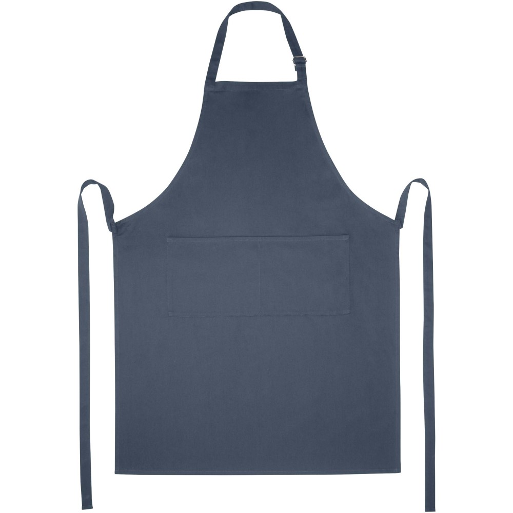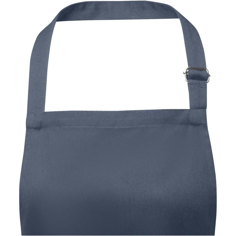 Vastag és masszív anyag, ugyanakkor puha és kényelmes viselet. A két elülső zseb gyors és egyszerű módot kínál a konyhai eszközök tárolására. A kötény nyakában csattal állítható, hátul megköthető. Nagyméretű nyomtatási lehetőség a logók megjelenítéséhez. Pamut twill 65% poliészterből és 35% pamutból, 240 g/m2.
