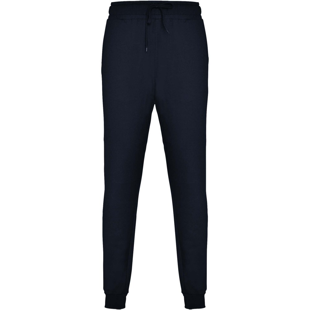 Sportnadrág széles, állítható derékkal és húzózsinórral, szűkített szegélyekkel a lábakon, megerősített varratokkal, bordás oldalsó zsebekkel és díszített varrássú hátsó zsebbel. Levehető címke.