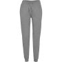 Sportnadrág széles, állítható derékkal és húzózsinórral, szűkített szegélyekkel a lábakon, megerősített varratokkal, bordás oldalsó zsebekkel és díszített varrássú hátsó zsebbel. Levehető címke.