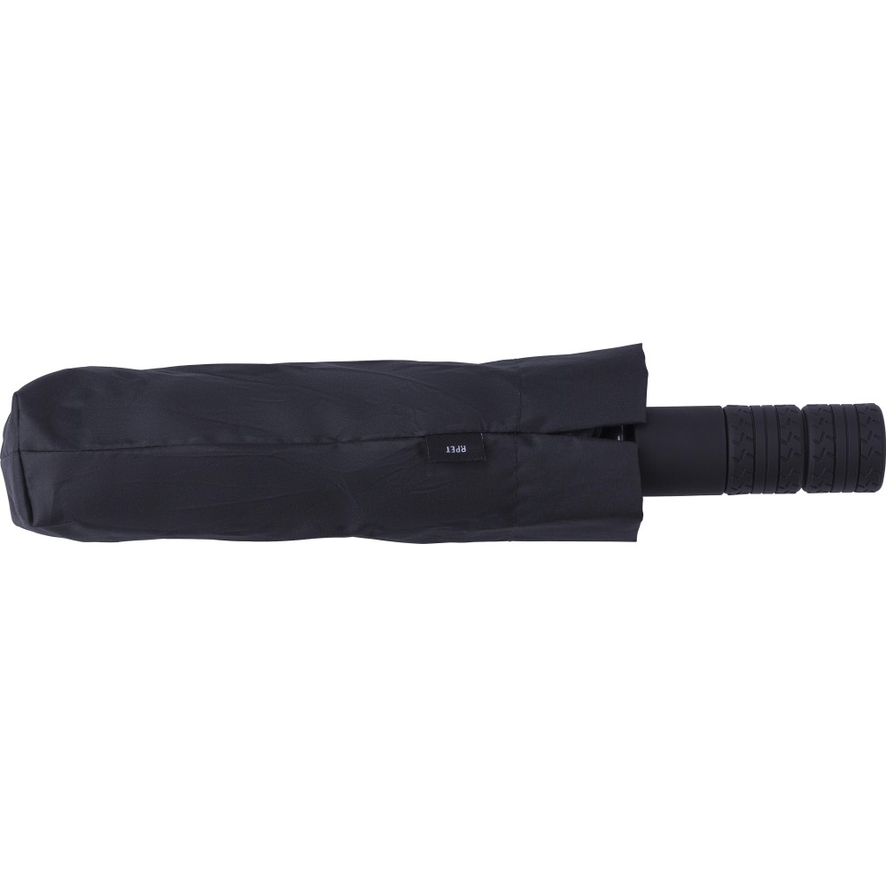 Automata nyitású és zárású, összecsukható esernyő 8 panellel, tokkal. Nyele gumis mintázatú, az autók abroncsára emlékeztet. Vászna RPET pongee anyag. Mérete: 21".