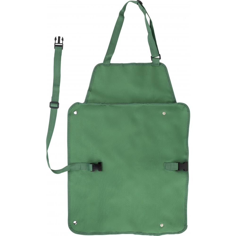 Barbecue kötény. A zsebek tartalma: hússütő villa, kés, fogó, lapát, só- és borsszóró, edényfogó kesztyű.