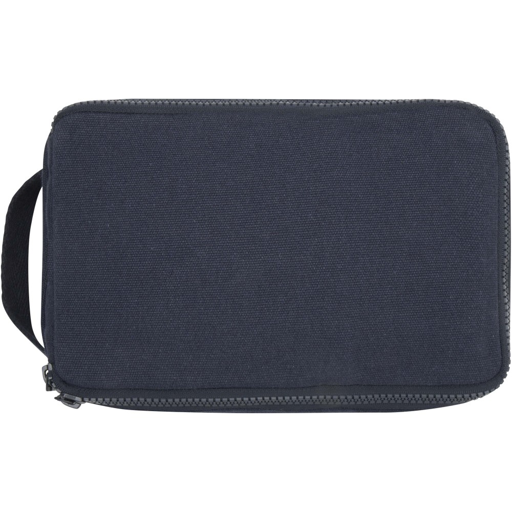 Piperetáska 500 g/m2 újrahasznosított pamutból és poliészterből, tágas fő rekesszel, biztonságos cipzáras záródással és több belső zsebbel, amely ideális piperecikkek tárolására. Sokoldalú kialakításának köszönhetően kisebb tárgyak - például zoknik vagy töltők - rendszerezésére is kiváló, így a csomagok rendezetten tarthatók. A táska Cyclo újrahasznosított szálakat tartalmaz, amelyek előválogatott hulladékból készülnek, és ennek megfelelően alakul a fonal színe is. Ezek a szálak nemcsak a primer nyersanyagok iránti igényt csökkentik, hanem elköteleződést is mutatnak a körforgásos szemlélet iránt, elősegítve a hulladékcsökkentést és a zárt rendszerű gyártást. Minden táskához tartozik egy Aware nyomkövető is, amelynek QR-kódja révén nyomon követhető a termék eredete és útja, ezáltal fokozva az ellátási lánc átláthatóságát, és erősebb kapcsolatot teremtve a felhasználó és a termék gyártási folyamata között.
