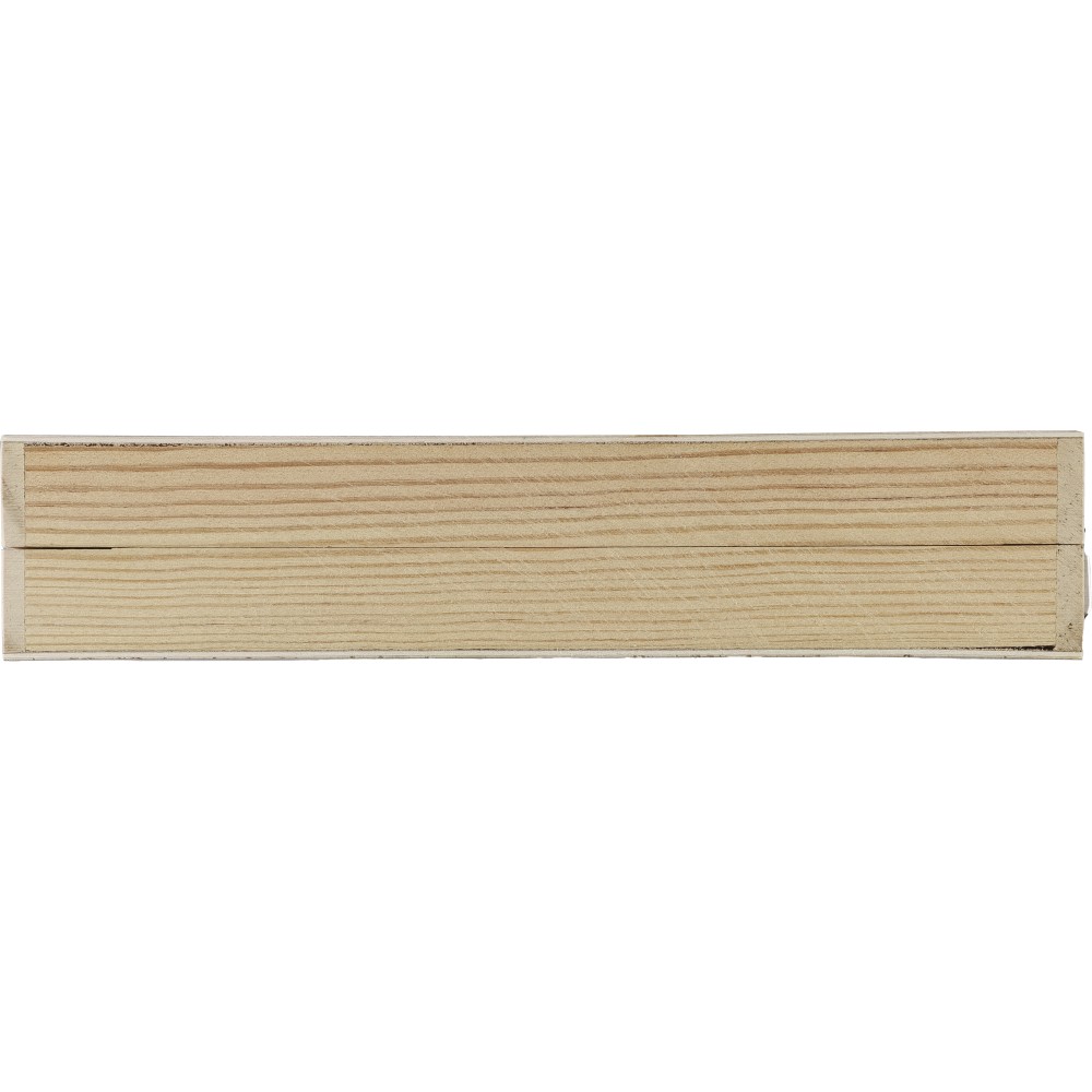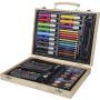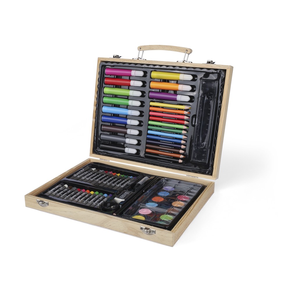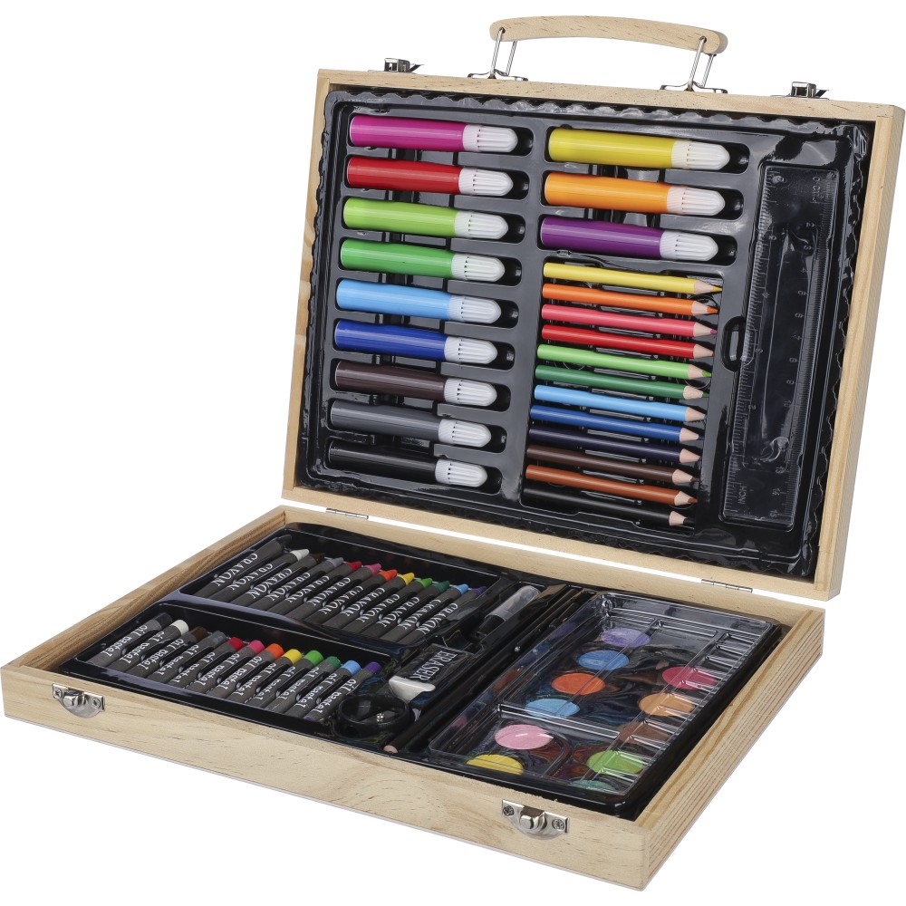 66 db-os rajzkészlet fa tartóban, fa fogantyúval. Tartalma: 12 db zsírkréta, 12 db színes filctoll, 12 db kihegyezett színes ceruza, 12 db olajpasztell kréta, 12 db festék, ragasztóstift, radír, ceruzahegyező, vonalzó, ecset és festőpaletta. Csomagolása barna papírdoboz.