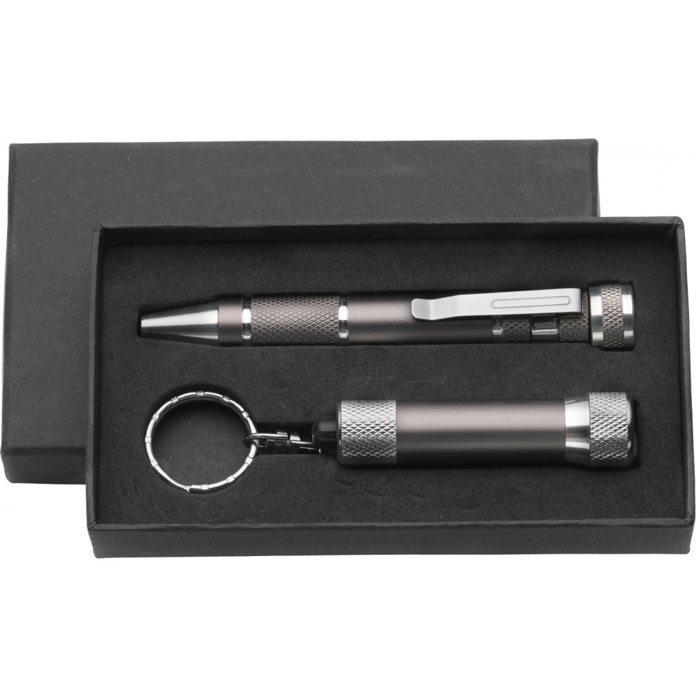 Tartalma: toll alakú csavarhúzó, 4 db sima csavarhúzó, 4 db csillagcsavarúzó fej, 3 LED-es zseblámpa és kulcstartó. Az elemet tartalmazza.