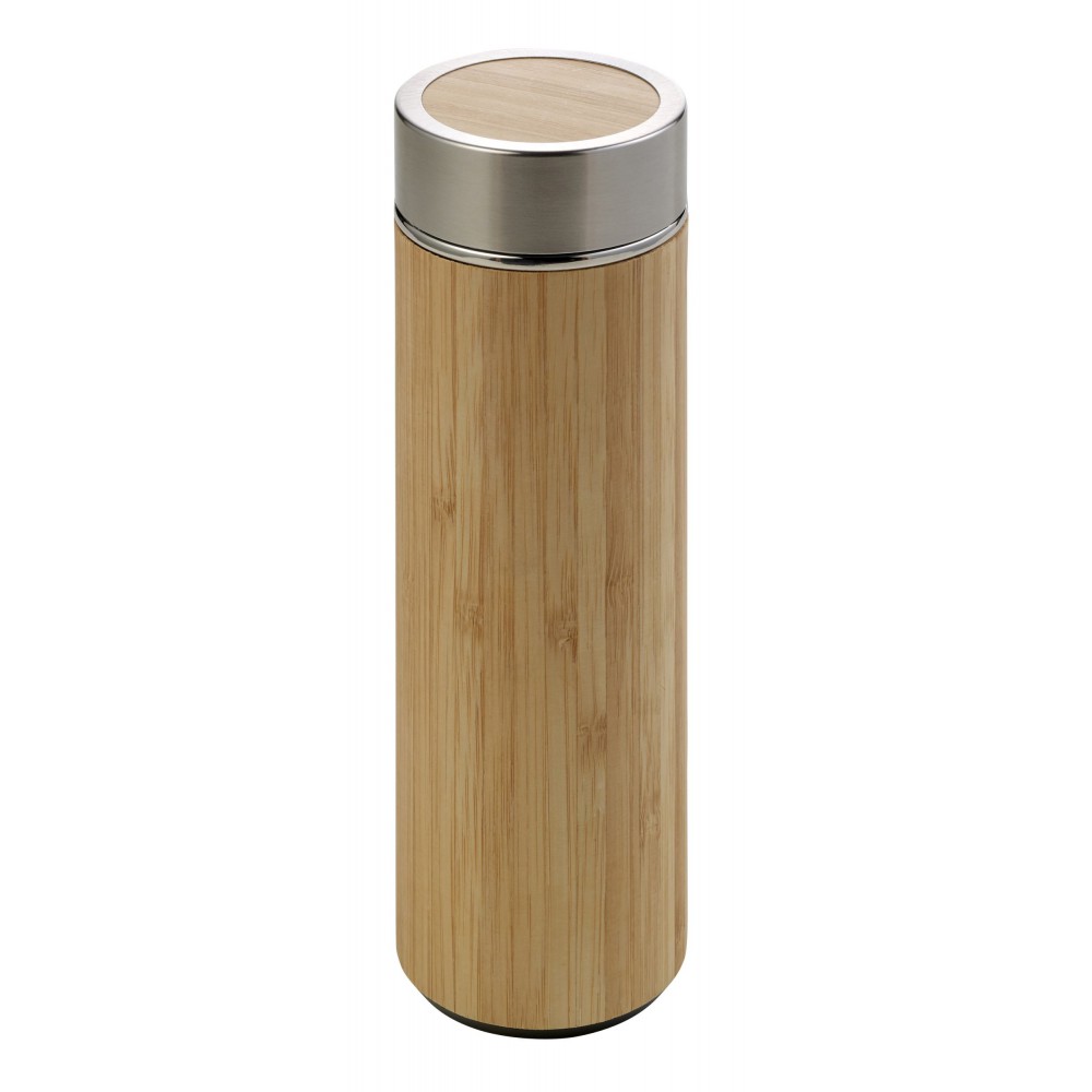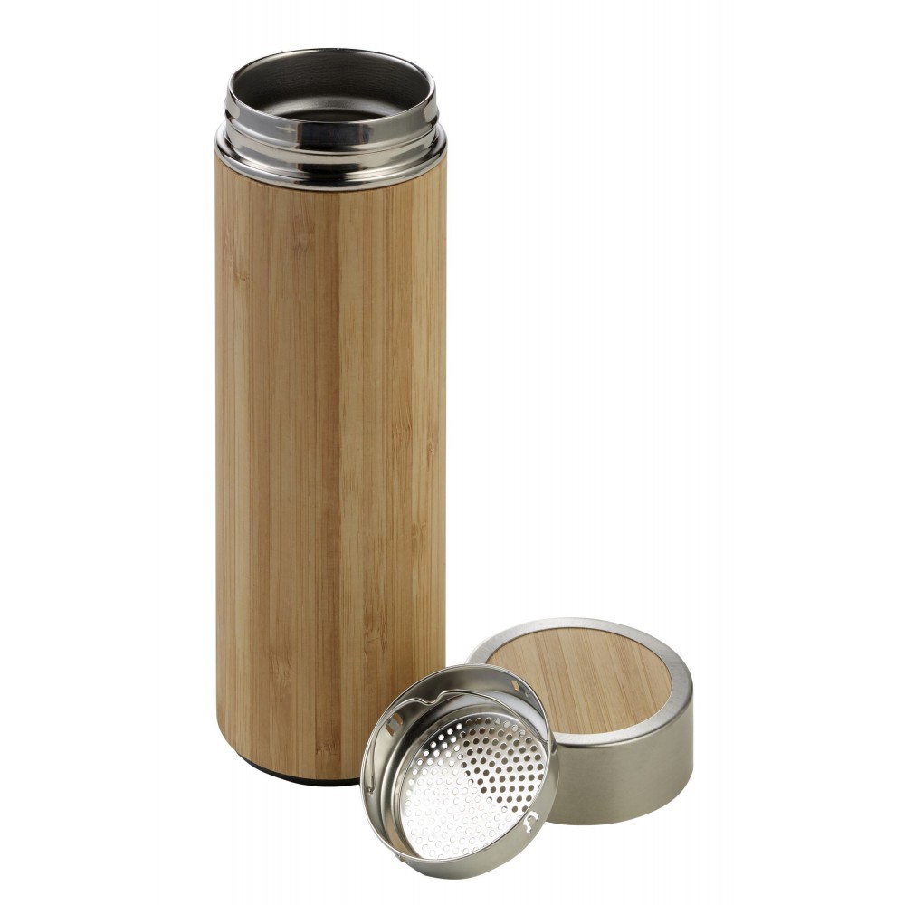 Duplafalú, vákuumos termosz fém teaszűrővel. Űrtartalom: 420 ml. Bambusz és rozsdamentes acél. Csomagolása fehér papírdoboz.