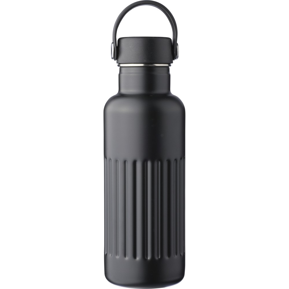 Újrahasznosított rozsdamentes acél termosz, 500 ml. A belső 304-es, a külső 201-es rozsdamentes acélból készült, bordás markolattal, PP és fém fedéllel, műanyag hordozófüllel. Gravírozott újrahasznosított logó található a terméken. Csomagolása barna papírdoboz.