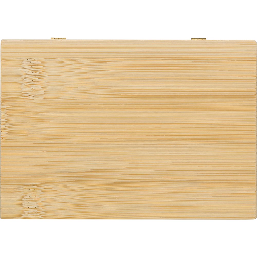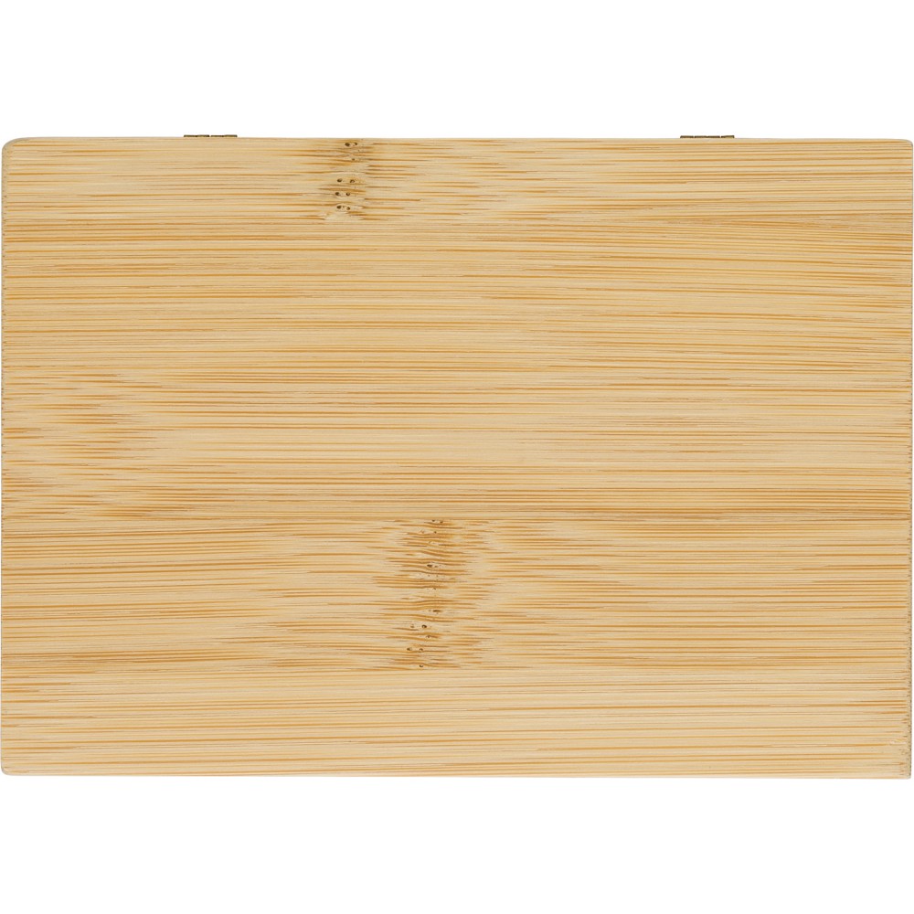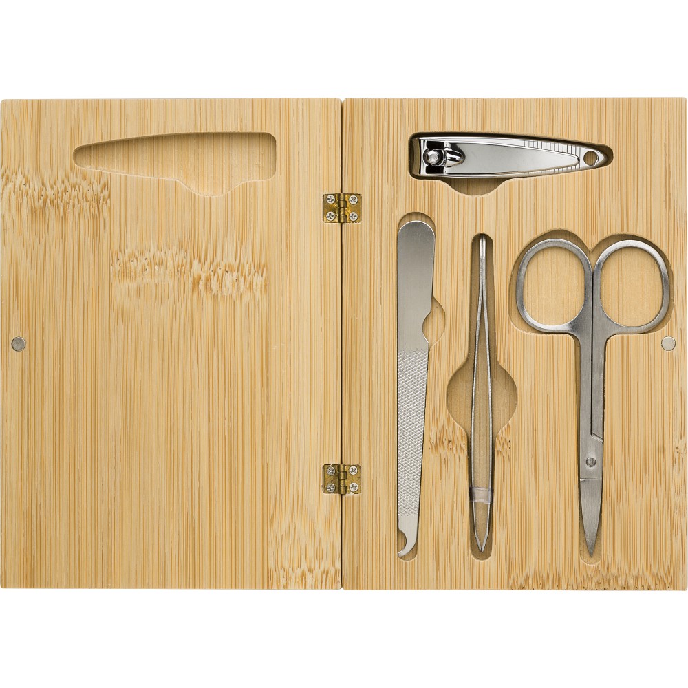 Manikűrkészet mágneses záródású bambusz tartóban. Négy darab eszközt tartalmaz. Csomagolása barna papírdoboz.