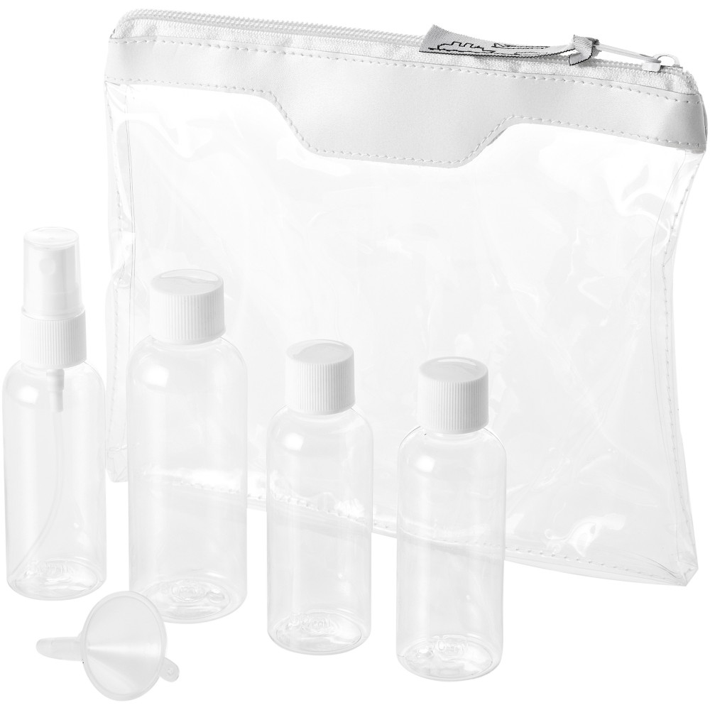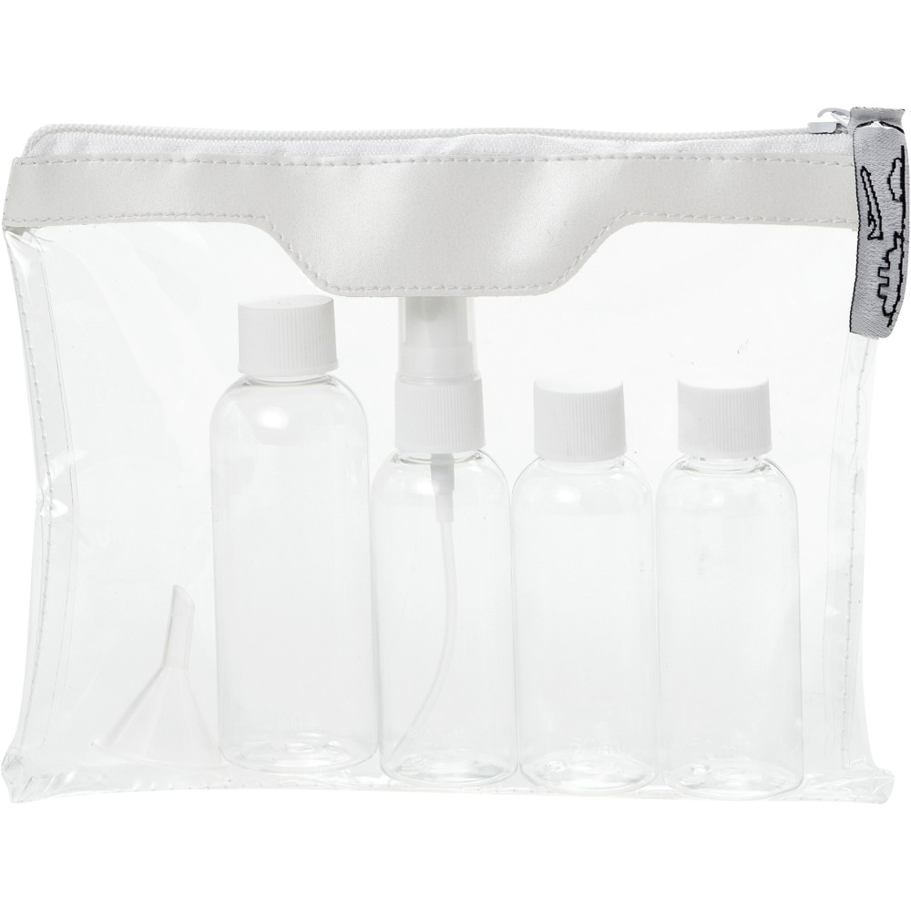 Légitársaságok által jóváhagyott tisztaságcsomag, amit magával vihet a fedélzetre. Tartalma: 2 x 50 ml-es flakon, 1 x 90 ml-es flakon, 1 permetező és 1 tölcsér. A flakonok, a permetező és a tölcsér polietilén zacskóban, elkülönítve a tasaktól. Az alkotórészekre nem lehetséges dekoráció.
