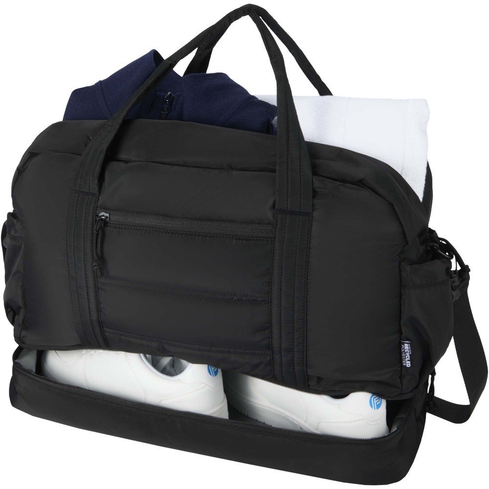 A Puffer sporttáska egyedi megjelenést ötvöz prémium minőségű, GRS tanúsítvánnyal rendelkező újrahasznosított alapanyagokkal, így ideális választás a mindennapi használathoz. A 30 literes űrtartalom tökéletes rövid utazásokhoz, edzéshez vagy hétköznapi teendőkhöz. A táska tágas, cipzáras fő rekesszel rendelkezik ruhák és felszerelések számára, valamint egy szigetelt, PEVA bélésű alsó rekesszel, amely lehetővé teszi a nedves és száraz holmik elkülönítését. A több belső és külső zseb segíti az átlátható rendszerezést, míg a bőröndre rögzíthető pánt, az állítható vállpánt és a kézifogantyúk sokoldalú hordozási lehetőséget biztosítanak. Könnyű és vízlepergető kialakításának köszönhetően ez a sporttáska könnyedén alkalmazkodik az életviteledhez.