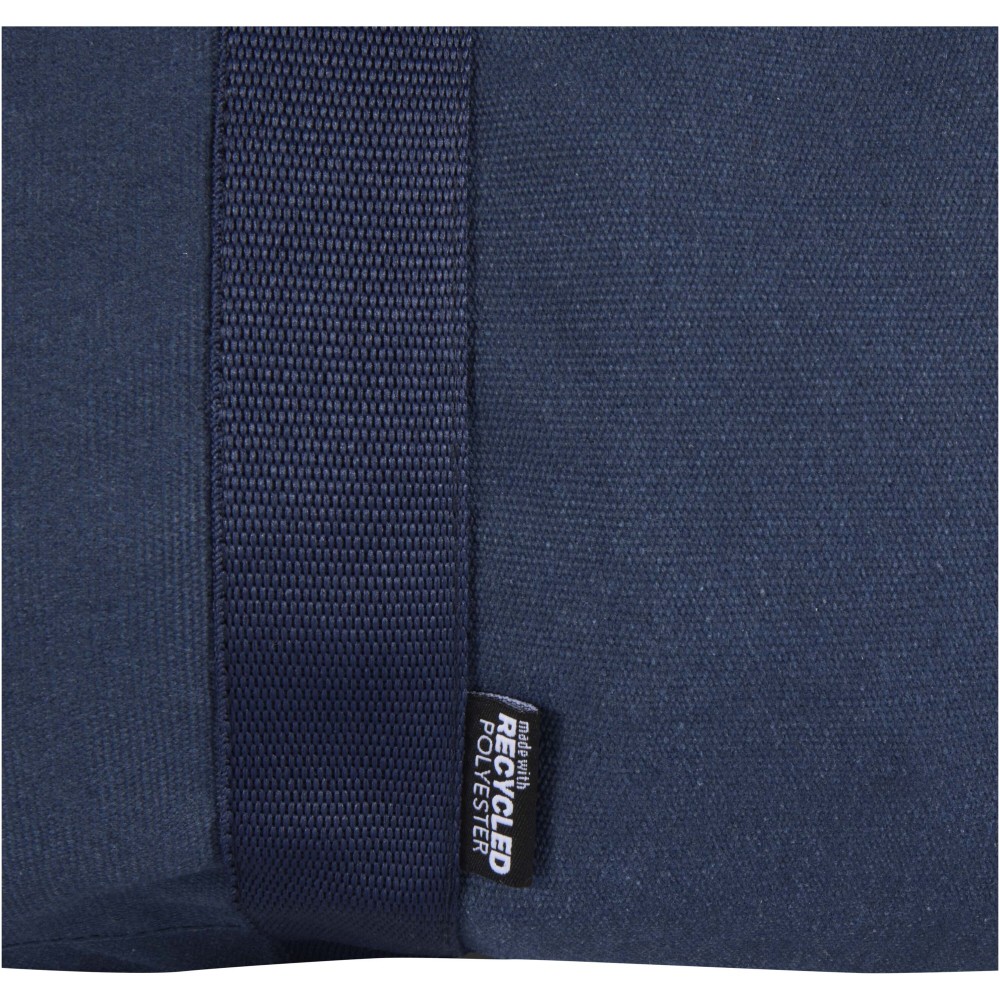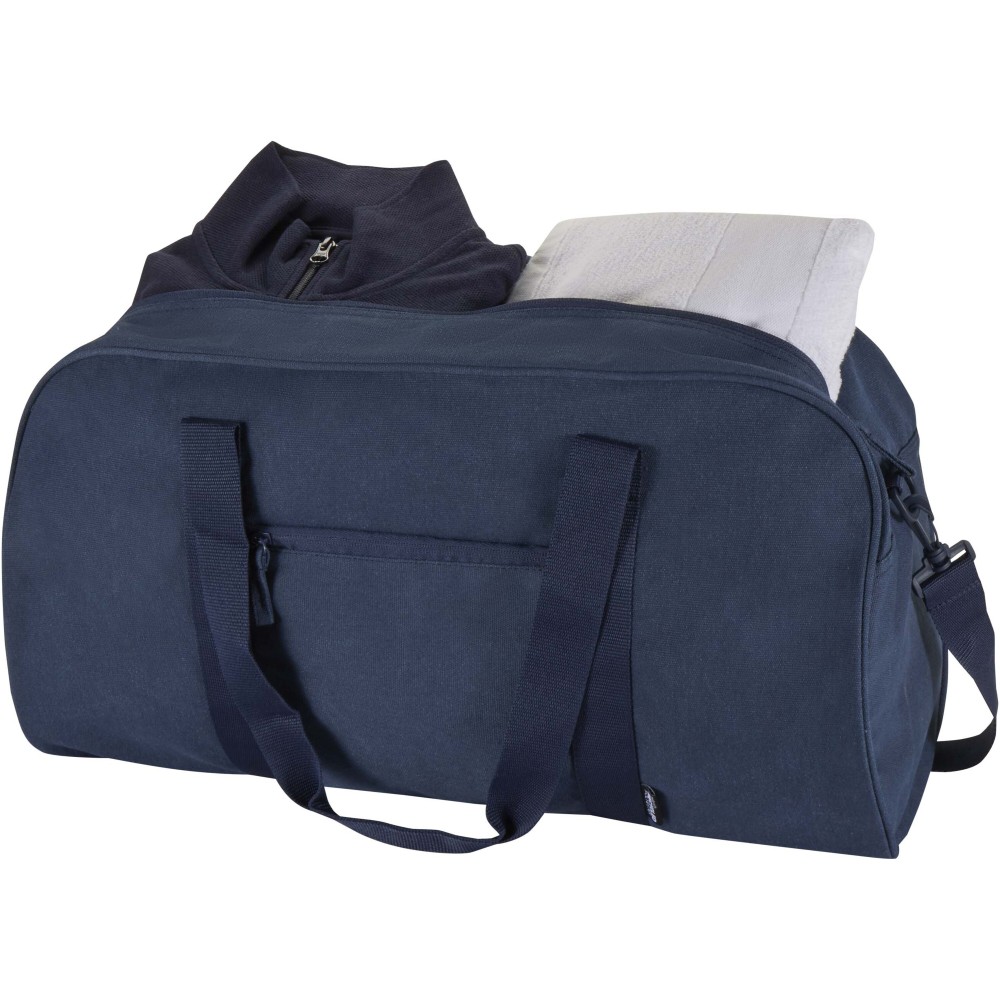 A Recanvas sporttáska GRS tanúsítvánnyal rendelkező, újrahasznosított és vízlepergető vászonból készült. A 40 literes űrtartalmú táska tágas főrekesze mellett egy cipzáras elülső zsebbel rendelkezik a gyorsan elérhető tárgyak számára, a kényelmes használatot pedig puha hordfülek, valamint a rugalmas hordozási opciókat biztosító lecsatolható és állítható vállpántok segítik. Kialakítása révén tökéletes választás edzőtermi használatra, hétvégi utazásokhoz vagy napi igénybevételre.